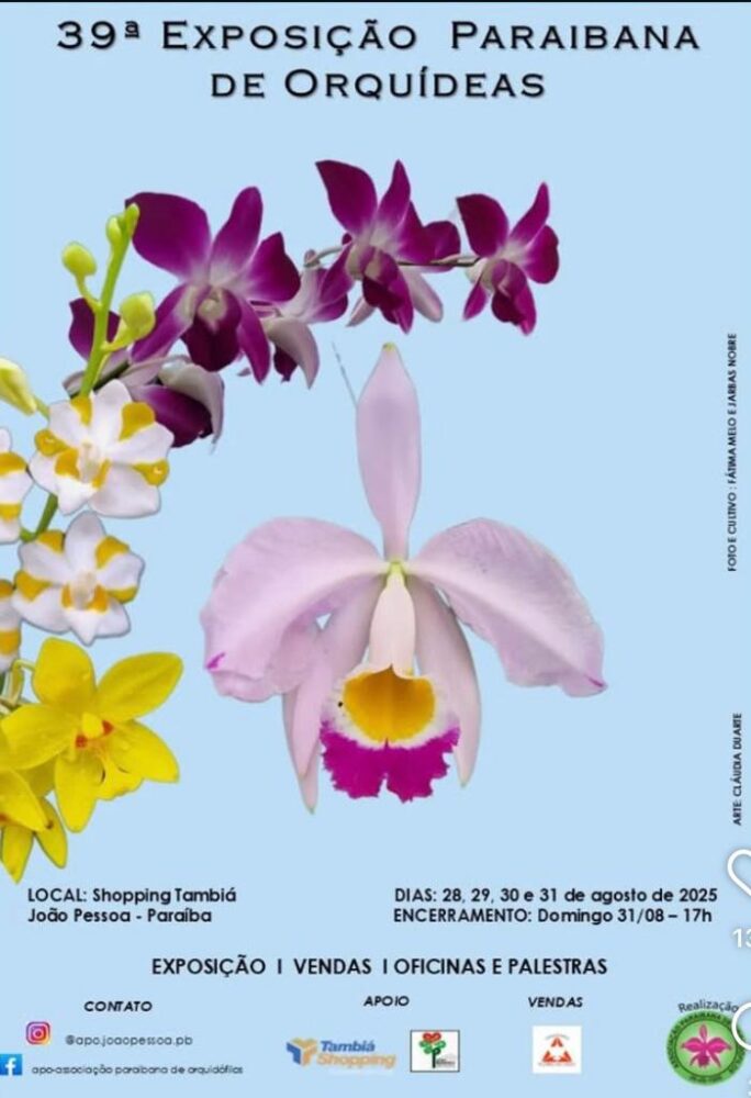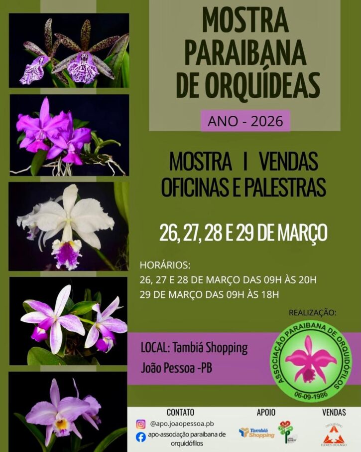 A Mostra Paraibana de Orquídeas – 2026, realizada pela APO, está agendada para os dias 26, 27 e 28 de março. Como acontece tradicionalmente, o cenário será o Tambiá Shopping (Rua Deputado Odon Bezerra, 184 – Tambiá) , em João Pessoa. É aguardada a presença dos amantes de orquídeas não apenas da Paraíba, mas também dos estados vizinhos.