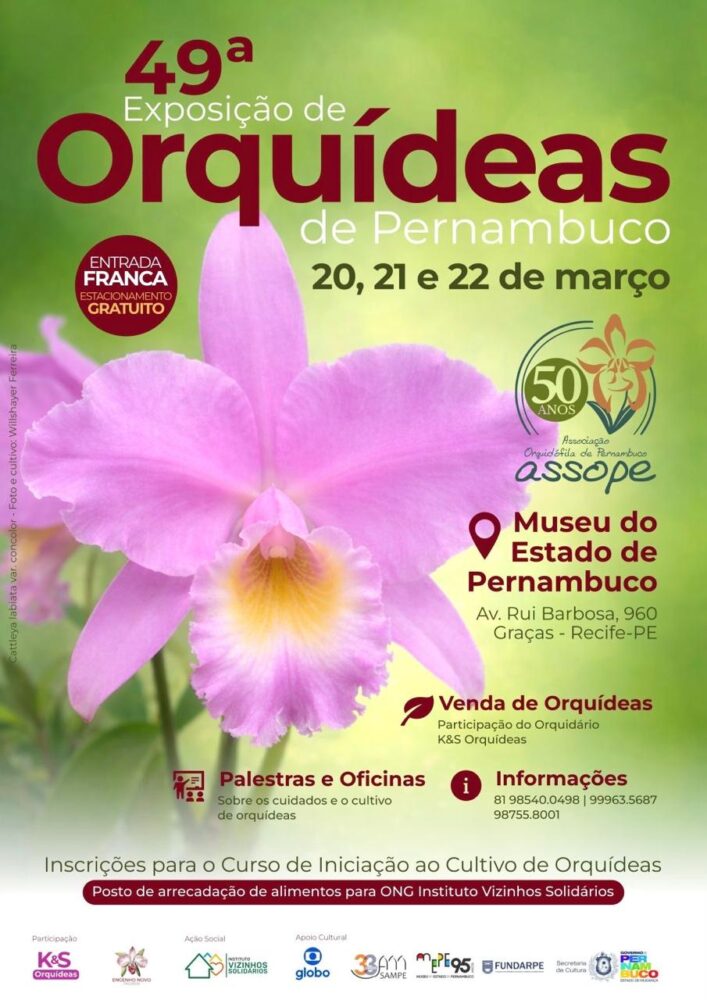 Os orquidófilos nordestinos têm encontro marcado, no Recife, nos dias 20, 21 e 22 de março. É quando se realiza a 49ª Exposição de Orquídeas de Pernambuco, promovida pela AOSP. Local: Museu do Estado de Pernambuco (Av. Rui Barbosa, 960 – Bairro de Graças). Está programada a realização de um Curso de Iniciação ao Cultivo de Orquídeas no recinto do grande evento.