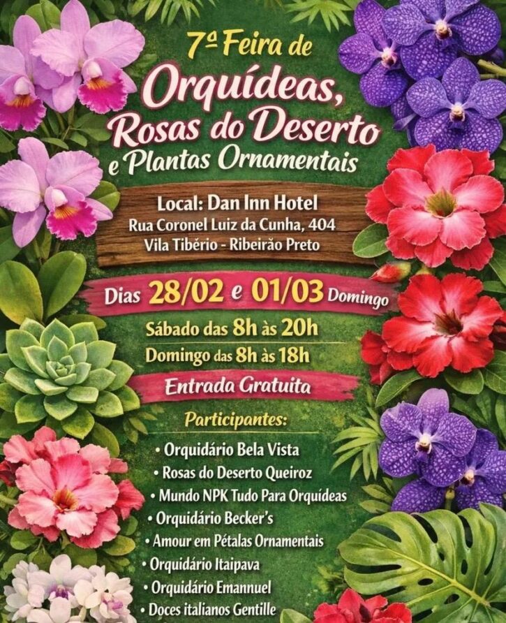 Com a 7ª Feira de Orquídeas, Rosas do Deserto e Plantas Ornamentais, que terá lugar em Ribeirão Preto, entre 28 de fevereiro e 1º de março, os orquidófilos paulistas abrem uma intensa programação de eventos. A Feira acontecerá no Dan Inn Hotel (Rua Coronel Luiz da Cunha, 404, na Vila Tibério). A entrada é gratuita.